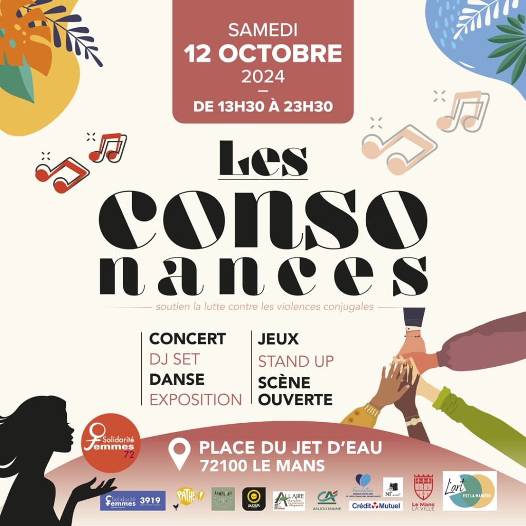 La première édition de notre événement solidaire et culturel, dédié à la lutte contre les violences conjugales, se tiendra le samedi 12 octobre sur la place du Jet d’Eau au Mans.
